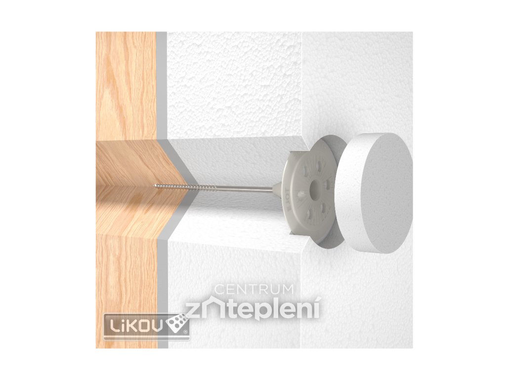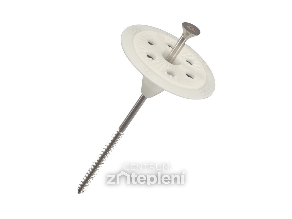 Talířovou hmoždinku přiložíme k tepelně izolační desce z polystyrenu nebo minerální vaty. Za pomoci šroubu upevníme izolant k podkladu do hloubky min. 30 - 40 mm dle typu podkladu. Po zašroubování vložíme do talířové hmoždinky zátku, která je součástí balení. Abychom předešli nežádoucímu prohnutí tepelné izolace kotvíme izolaci ve všech spojích izolačních desek a jednou až třemi hmoždinkami do plochy desky, vždy v místě naneseného lepidla. Spotřeba hmoždinek na 1m2 je cca 6 - 8 kusů, dle podkladu. U novostavby určíme správnou délku hmoždinky EJOT STR H s kovovým trnem součtem kotevní hloubky a tloušťky izolantu a 20 mm vrstvy lepidla (např.: na zateplení 100 mm polystyrenem použijeme hmoždinky o délce 160 mm). U rekonstrukcí, kde kotvíme přes již stávající omítku (břízolit, štuková nebo minerální omítka) je nutné připočítat sílu této vrstvy do celkové délky hmoždinky (zpravidla 20-30 mm). Po ukotvení všech talířových hmoždinek zastěrkujeme viditelné talířky a tepelnou izolaci vhodným fasádním lepidlem a následně vytvoříme s vloženou sklotextilní perlinkou výztužnou armovací vrstvu.
