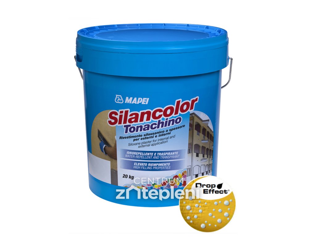 Pastovitá omítková směs Mapei Silancolor Tonachino na bázi silikonové pryskyřice vhodná pro použití jak v exteriéru tak i v interiéru. Díky speciální receptuře zajišťuje omítka dobrou propustnost vodních par z podkladu a také značnou vodoodpudivost povrchu. Omítka Mapei Silancolor Tonachino neumožňuje propouštět vodu do podkladu, čímž zaručuje uchování stále suché omítky. Vlákny vystužená omítka s novými syntetickými materiály zaručuje jednotný barevný vzhled, dobrou přídržnost k původním povrchům a dobře přikotveným vrstvám k podklad a širokou barevnou škálu. současně zaručuje velmi dobré hydrofobní vlastnosti. Na rozdíl od běžných syntetických úprav nevytváří na povrchu film, nepropustný pro vodní páry, protože se jedná o porézní vrstvu. Omítka Mapei Silancolor Tonachino obsahuje syntetická vlákna, která zajišťují dobrou odolnost proti vzniku trhlin. Pastovitá stěrková omítka má dokonalou přídržnost ke vše typům tradičníc a odvlhčovacích omítek a starým nátěrům za předpokladu, že jsou dobře přikotveny k podkladu. Vodoodpudivé vlastnosti omítky Mapei Silancolor Tonachino zaručují ochranu podkladu před agresivními chemickými vlivy a ulpínáním nečistot na povrchu. Omítka má vynikající odolnost proti působení škodlivého UV zaření a stárnutí a současně dlouhodobě udržuje své vlastnosti. Fasádní omítky Mapei Silancolor Tonachino má příjemný rustikální vzhled a kromě barev ze vzorníku MAPEI je k dispozici v široké škále barevných odstínů, které lze namíchat pomocí automatického systému barvení Colormap®. Před použitím Mapei Silancolor Tonachino aplikujte na připravený podklad vždy vrstvu Silancoloru Primer nebo Silancoloru Base Coat. Pouze v případě aplikace na staré nátěry, dobře přikotvené k podkladu, posuďte v závislosti na savosti povrchu, zda je použití Silancoloru Primer nebo Silancoloru Base Coat nutné.