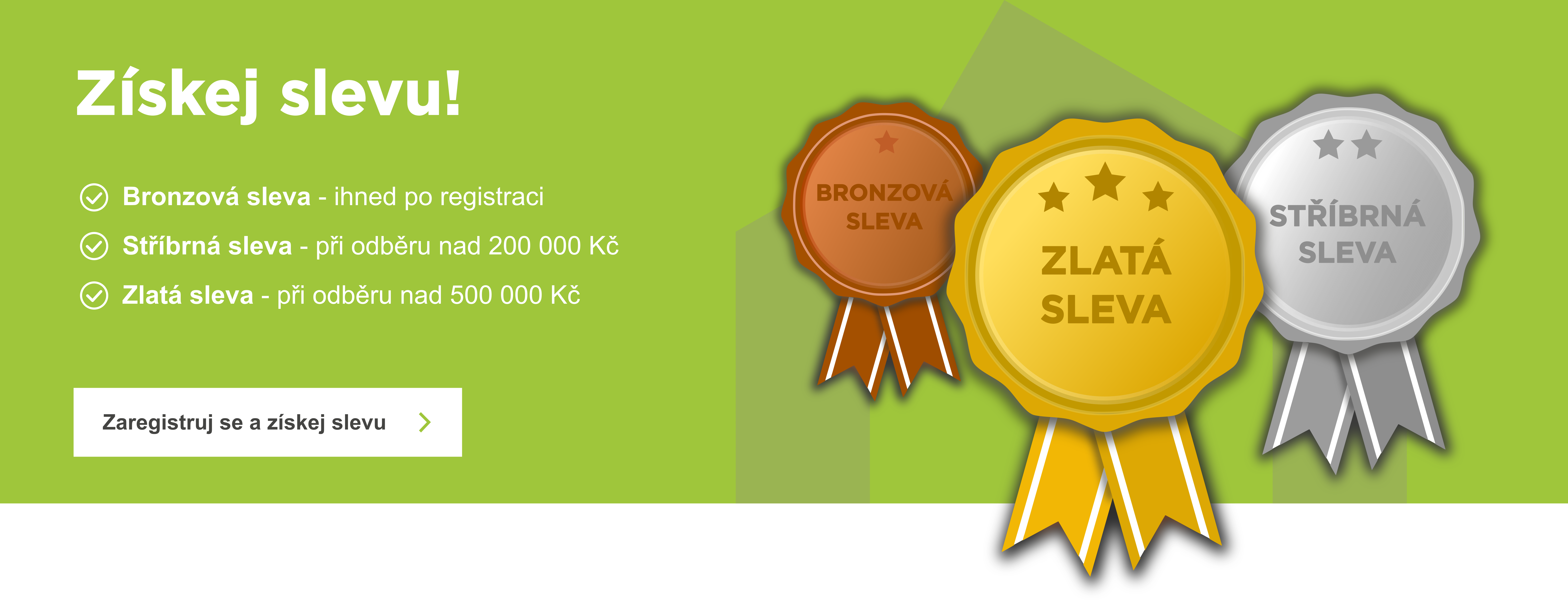 BRONZOVÁ sleva platí pro jednorázové i opakované objednávky. Po dosažení objednaného množství v celkové hodnotě min. 200 000 Kč získáte na další nákup STŘÍBRNOU slevu, která je ještě výhodnější. STŘÍBRNOU slevu nastavíme v systému až poté, co součet postupně nebo jednorázově objednaného množství dovrší, nebo přesáhne částku 200 000 Kč. O nastavení STŘÍBRNÉ slevy budete informování emailem. Po následném přihlášení do systému se Vám zobrazí ještě výhodnější ceny materiálů.